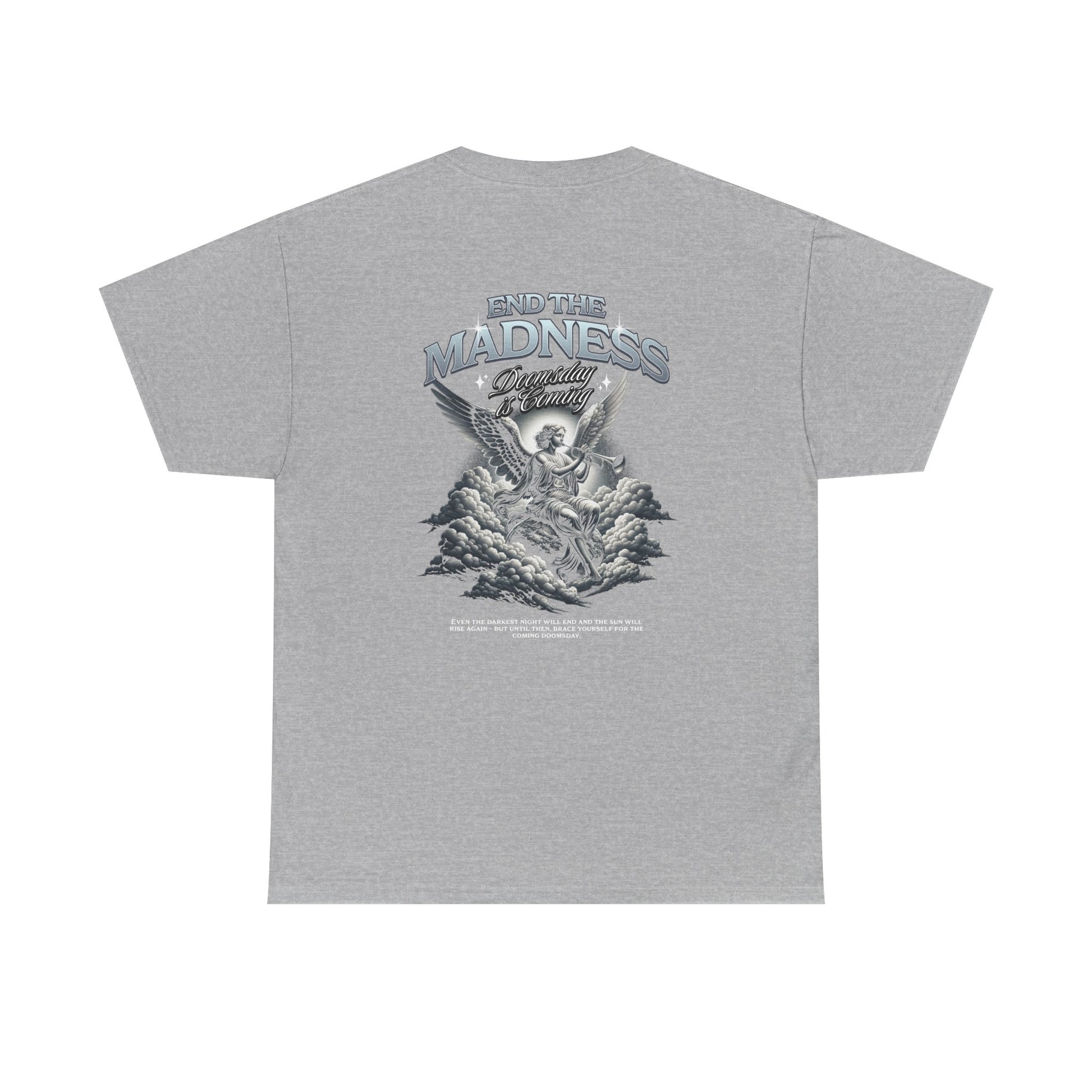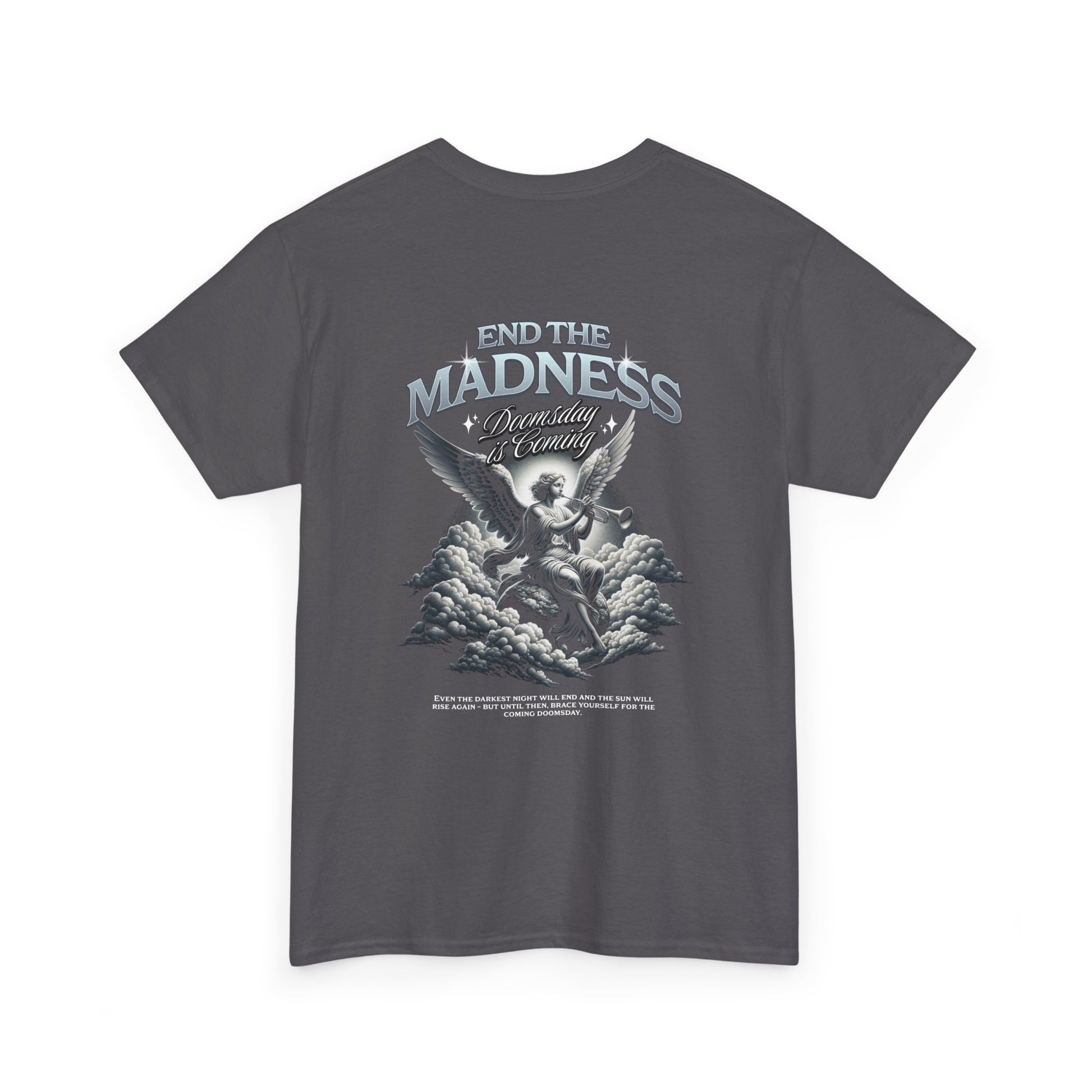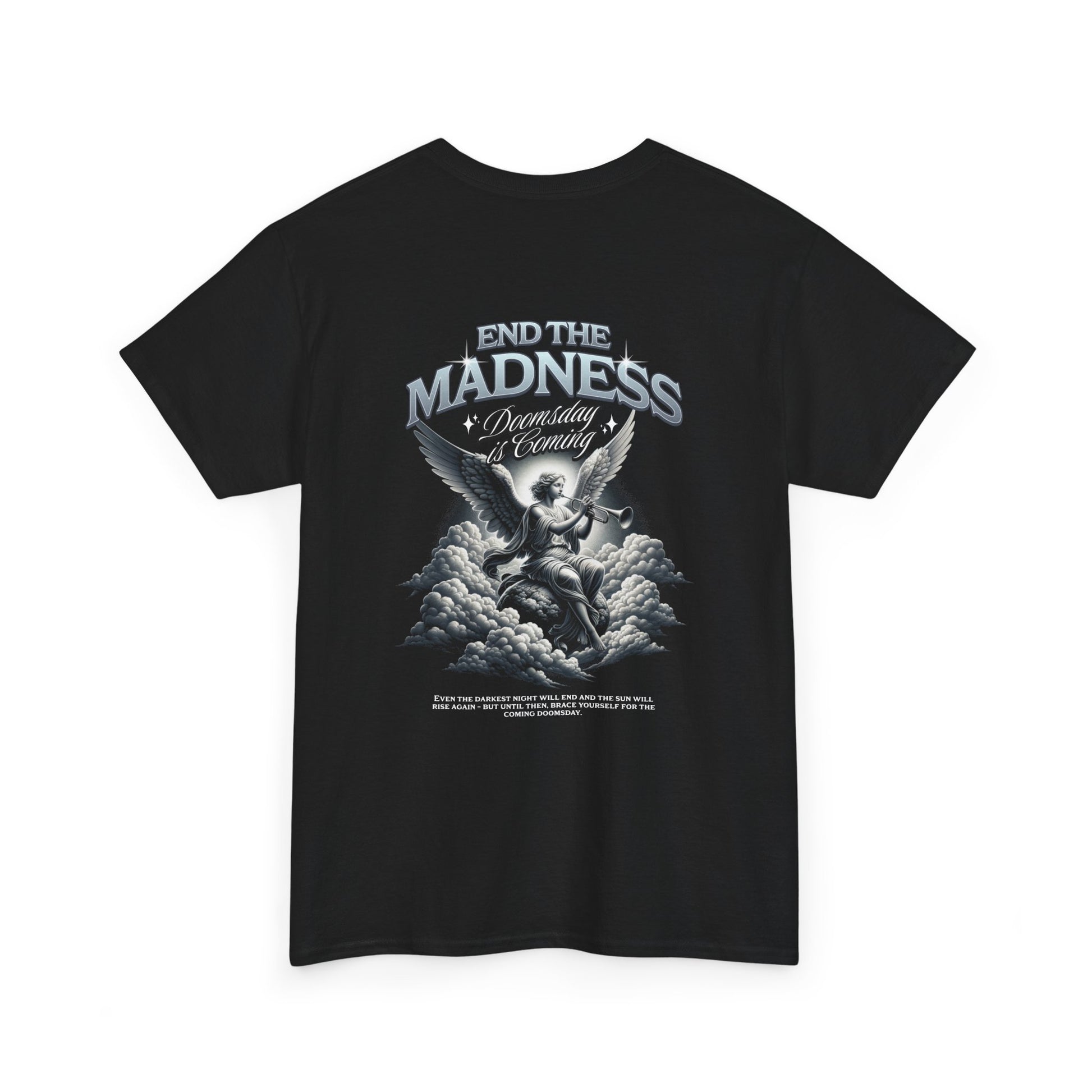 A relaxed, classic crew tee that carries a bold, vintage-rock attitude. The front chest bears a small, arched logo while the back explodes with an illustrated angel rising through clouds beneath the words “END THE MADNESS.” It feels like a worn tour shirt—soft to the touch, sturdy in the wash, and made to be lived in. Wear it on late-night drives, at backyard bonfires, or layered under a flannel when the air gets cold. The high-contrast print reads like a story: quiet on the front, unapologetic on the back. Built from responsibly sourced cotton with reinforced shoulders and a smooth, no-itch label, this tee balances statement-making graphics with everyday comfort.