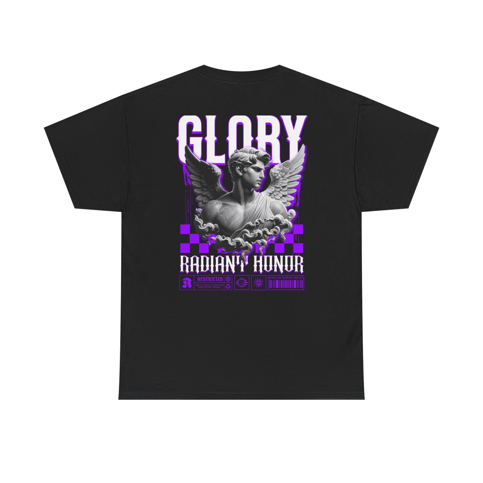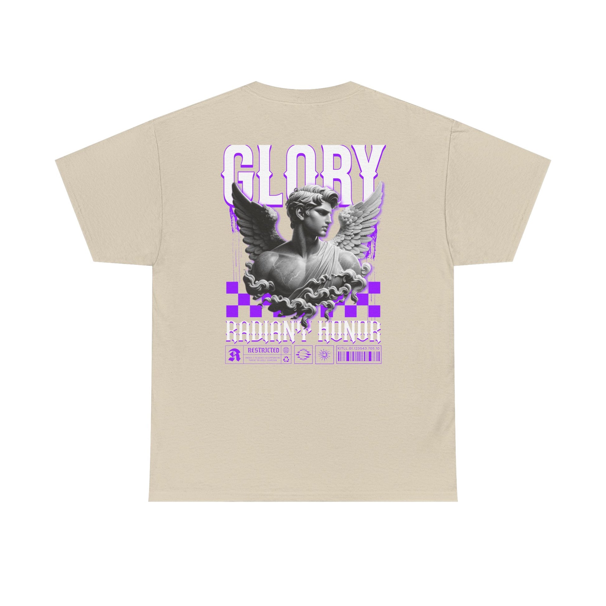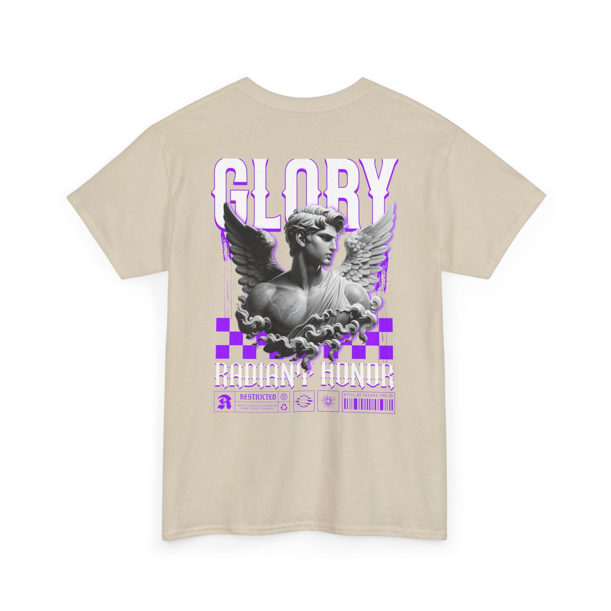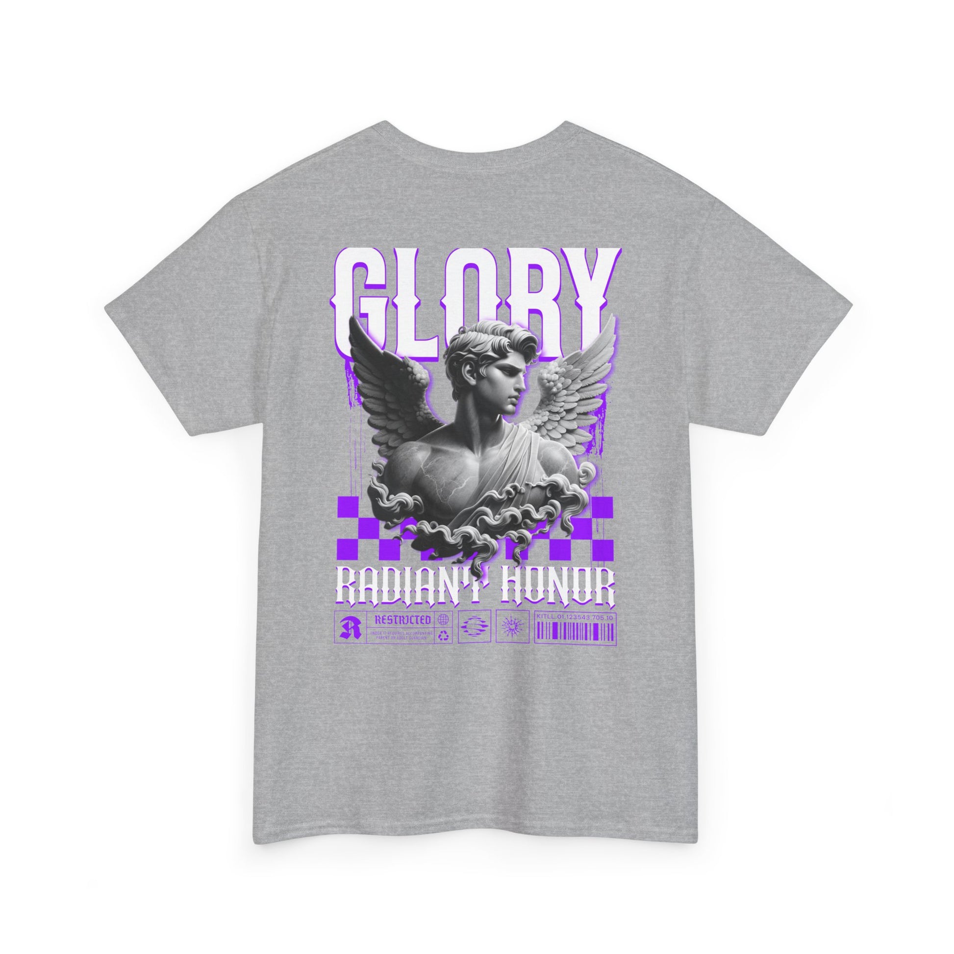This heavyweight classic tee brings a touch of alt-classical energy to everyday wear. Soft but sturdy 100% cotton carries a striking back print: a grayscale sculpted angel framed by bold, glitchy purple graphics and the word GLORY in tall type. The front chest carries a small matching emblem for a balanced look. It feels grounded on the body — substantial fabric, relaxed classic fit, and a clean crew neckline — while the dramatic back art does the talking. Wear it when you want a mix of museum-statue drama and neon‑edged street attitude. It layers easily under jackets or stands alone with jeans and boots, lending a confident, artful presence to concerts, late nights out, or creative meetups.