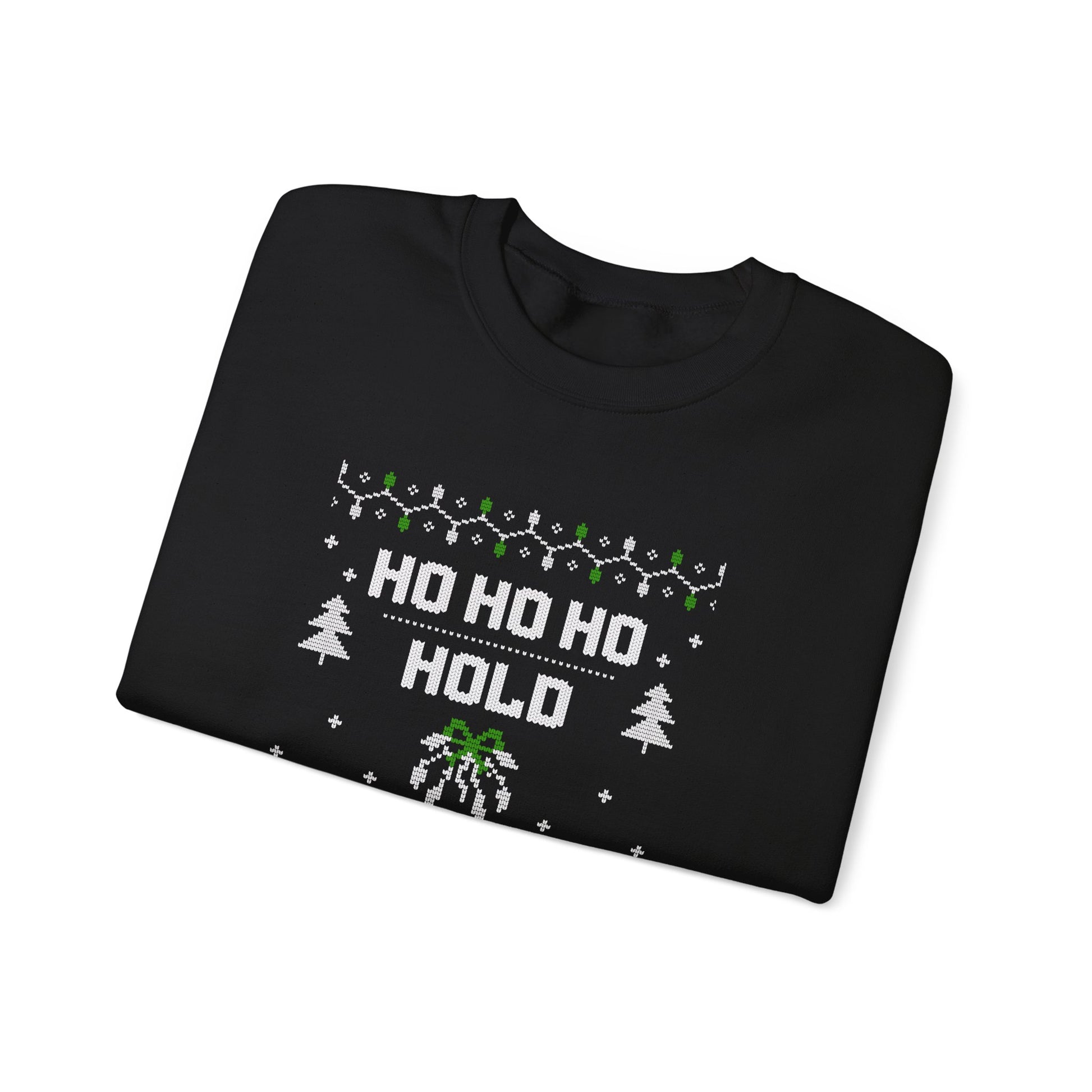 A cozy, cheeky holiday sweatshirt that blends classic knit-sweater charm with soft, durable everyday wear. The black crewneck features playful pixel-style holiday graphics and the bold phrase “Ho Ho Ho Hold My Drink,” accented with mistletoe and evergreen motifs. It feels warm against chilly evenings, resists fading through double-needle stitching and quality DTG/DTF printing, and wears like a familiar favorite — great for relaxed gatherings, lazy winter nights, and low-key holiday parties where a little humor goes a long way.