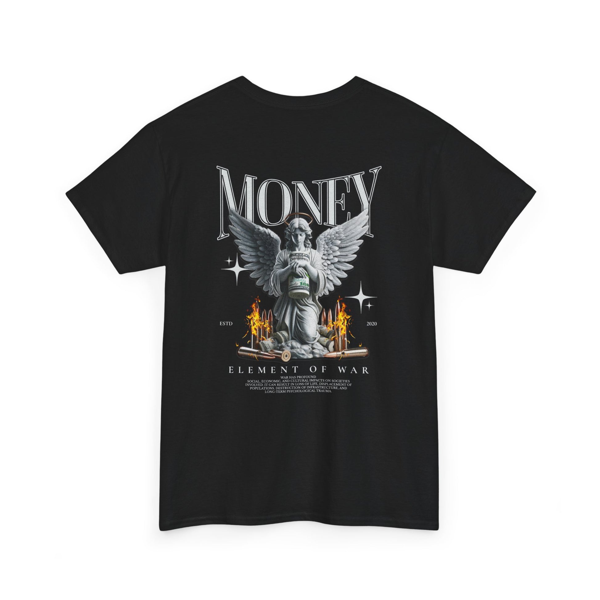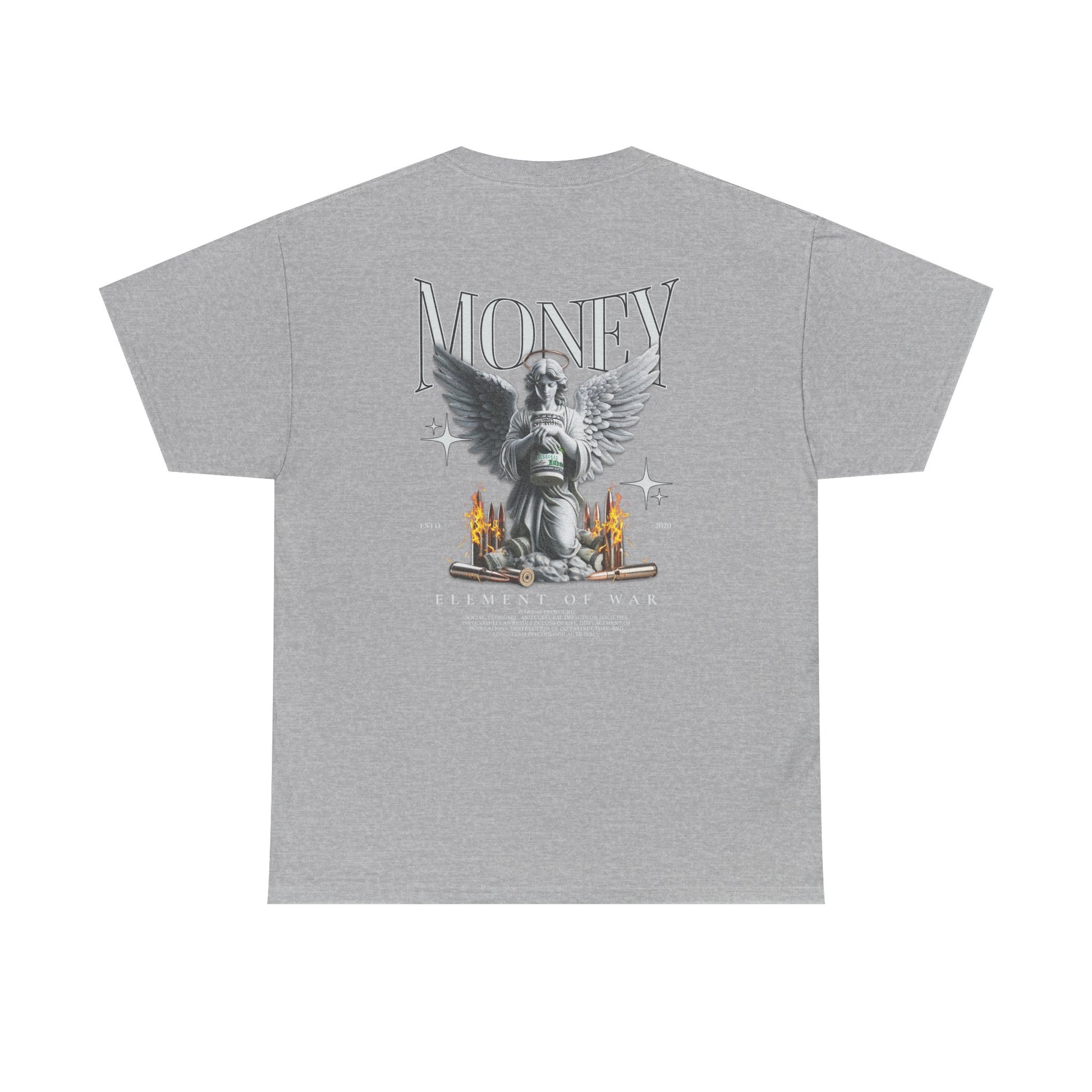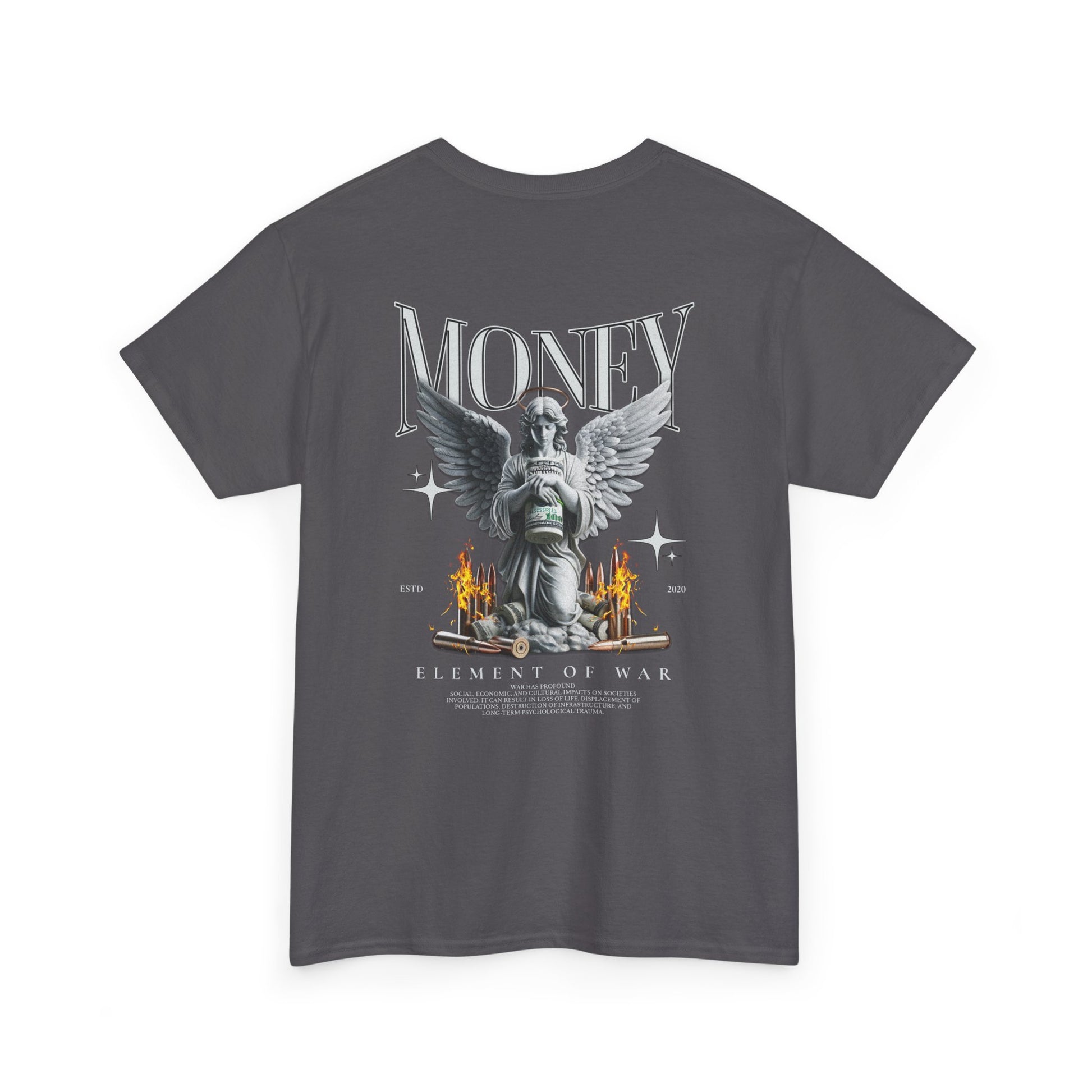 Money Angel Graphic Tee — Streetwear Statue & Flames Back Print