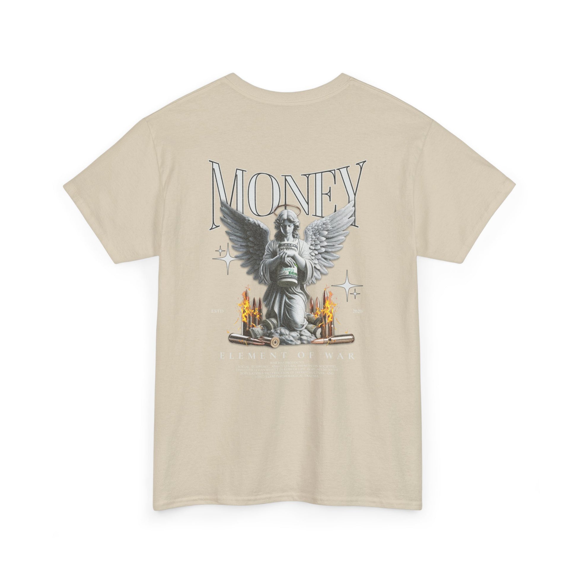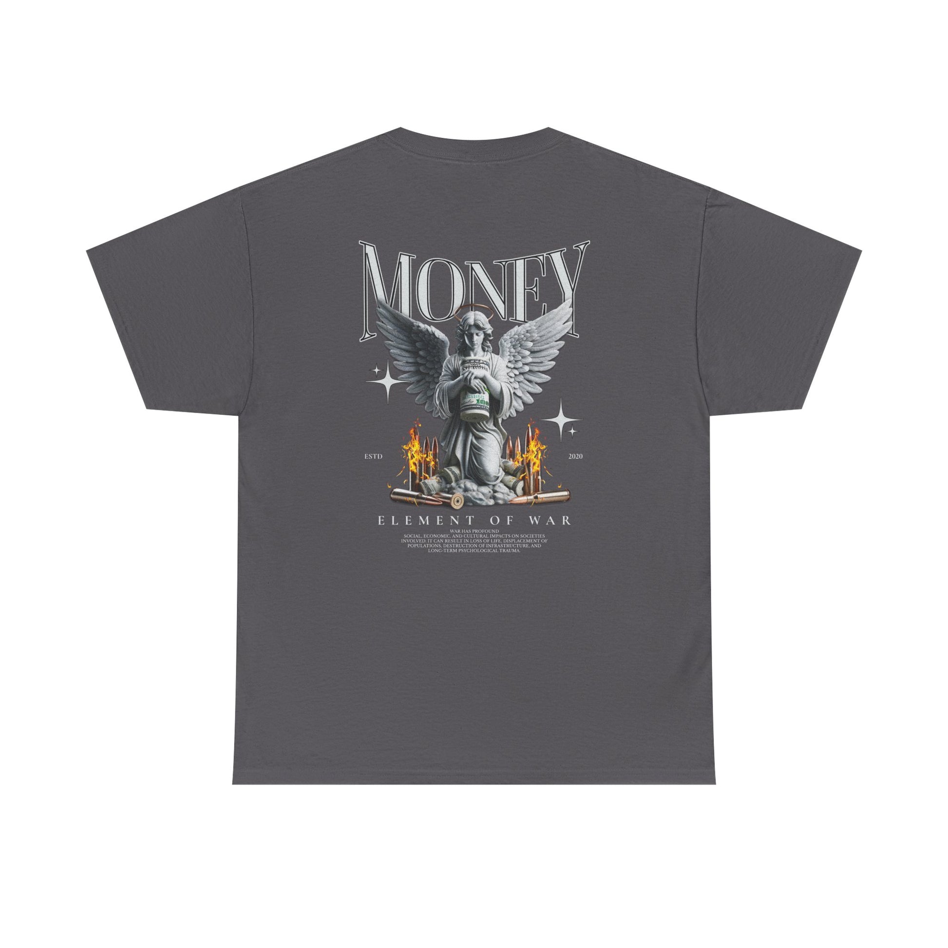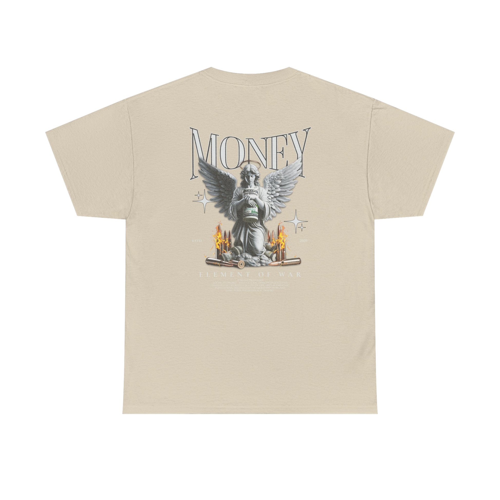 Money Angel Graphic Tee — Streetwear Statue & Flames Back Print