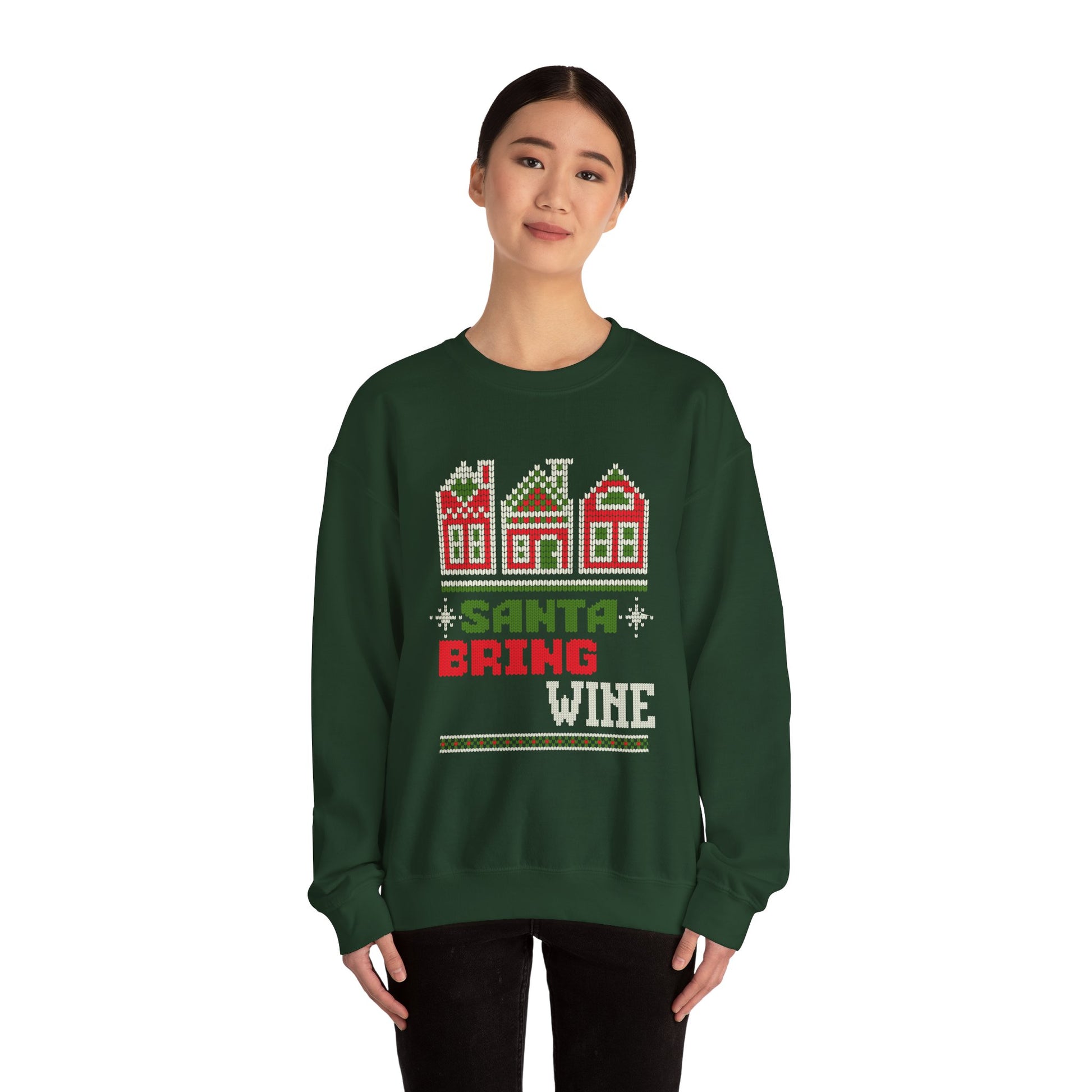 Soft, slightly oversized crewneck with a cozy holiday vibe. The light cream sweatshirt features a stitched-look, pixel-style row of gingerbread-like houses above playful block text that reads like a cheeky holiday slogan. Wear it on slow mornings with a mug of cocoa, or layered over a tee for chilly evening strolls past twinkling lights. The medium‑heavy cotton‑poly blend keeps warmth without bulk and the classic crew silhouette sits clean under coats or scarves. Subtle embroidery and quality construction mean this piece will feel lived‑in and durable season after season.